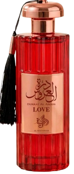 Durrat Al Aroos Love de Al Wataniah é um perfume Oriental Especiado Feminino. Esta é uma nova fragrância. Durrat Al Aroos Love foi lançado em 2025. As notas de topo são: Almíscar Branco e Nagarmota ou Óleo de Cipriol. As notas de coração são: Baunilha, Açafrão e Cardamomo. As notas de fundo são: Madeira Guaiac e Cumarina.