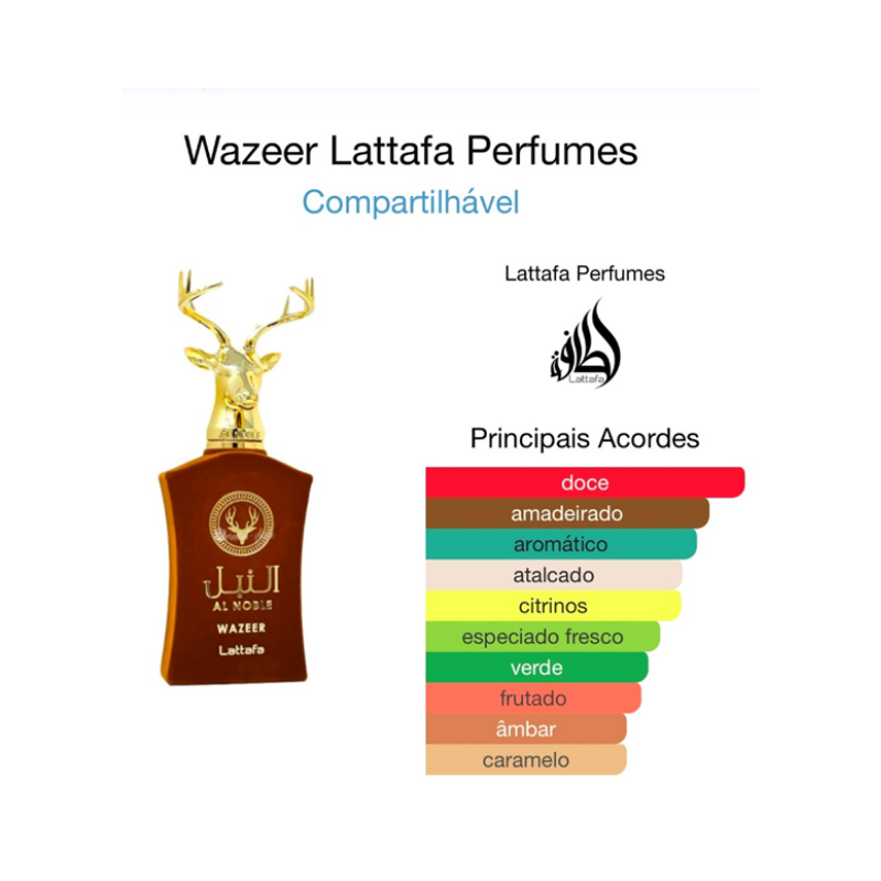 Wazeer de Lattafa Perfumes é um perfume Compartilhável. As notas de topo são: Hortelã, Laranja, Bergamota e Junípero ou zimbro. As notas de coração são: Chocolate, Caramelo, Pera, Framboesa e Íris. As notas de fundo são: Âmbar, Baunilha, Sândalo, Cedro, Almíscar e Vetiver.