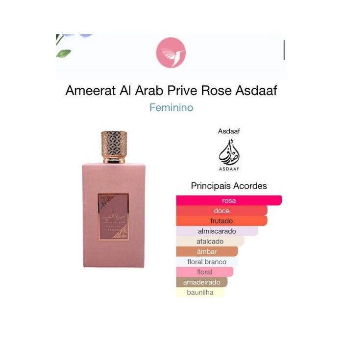Ameerat Al Arab Prive Rose de Asdaaf é um perfume Floral Frutado Feminino. Esta é uma nova fragrância. Ameerat Al Arab Prive Rose foi lançada em 2023. As notas de topo são: Morango, Uvas e Laranja. As notas de coração são: Rosa, Almíscar Branco, Jasmim, Gardênia, Ylang Ylang e Lírio. As notas de fundo são: Fava Tonka, Âmbar e Sândalo.