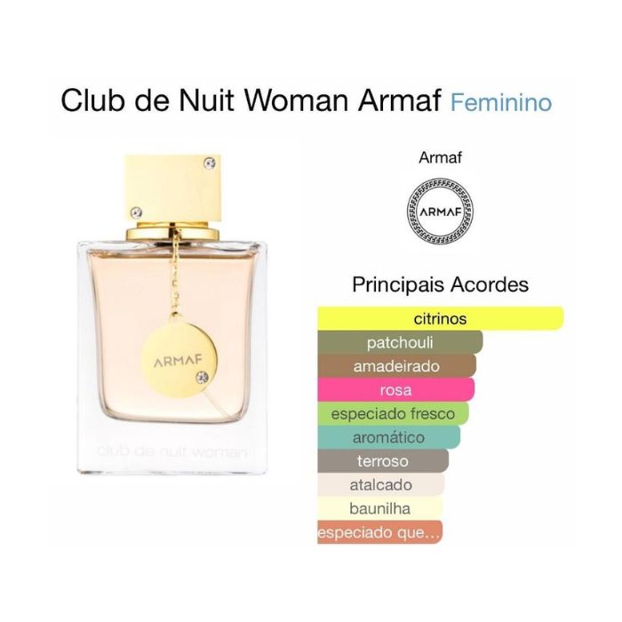 Club de Nuit Woman de Armaf é um perfume Floral Frutado Feminino. As notas de topo são: Laranja, Bergamota, Toranja e Pêssego. As notas de coração são: Rosa, Jasmim, Lichia e Gerânio. As notas de fundo são: Patchouli, Almíscar, Baunilha e Vetiver.