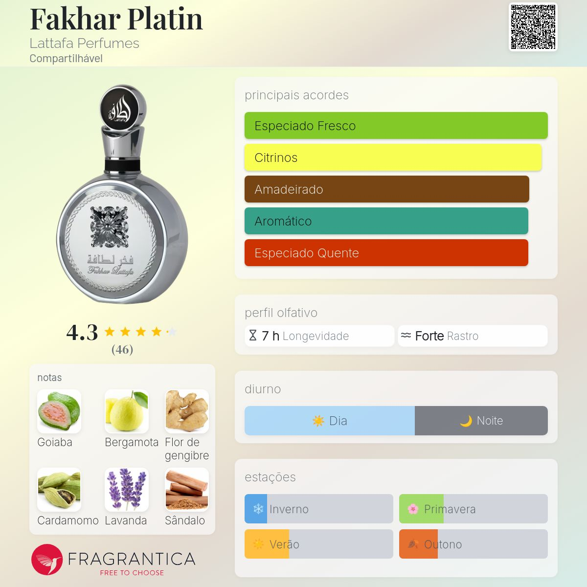 Fakhar Platin de Lattafa Perfumes é um perfume Aromático Fougére Compartilhável. Esta é uma nova fragrância. Fakhar Platin foi lançada em 2025. As notas de topo são: Bergamota, Cardamomo e Pimenta Rosa. As notas de coração são: Goiaba, Lavanda e Gengibre. As notas de fundo são: Sândalo, Palo Santo e Incenso.