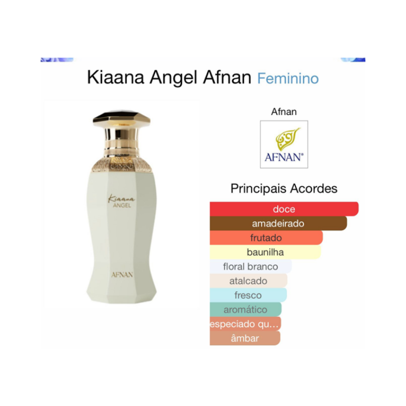 Kiaana Angel de Afnan é um perfume Floral Frutado Feminino. Esta é uma nova fragrância. Kiaana Angel foi lançada em 2024. As notas de topo são: Sorvete, Pistache e Bergamota. As notas de coração são: Jasmim, Pêssego Branco, Pera e Framboesa. As notas de fundo são: Fava Tonka, Sândalo e Cedro.