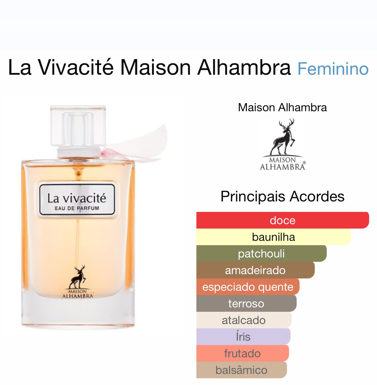 La Vivacité de Maison Alhambra é um perfume Floral Frutado Feminino. Esta é uma nova fragrância. La Vivacité foi lançada em 2024. As notas de topo são: Groselha Preta e Pera. As notas de coração são: Íris, Flor de Laranjeira e Jasmim. As notas de fundo são: Patchouli, Pralinê, Fava Tonka e Baunilha.