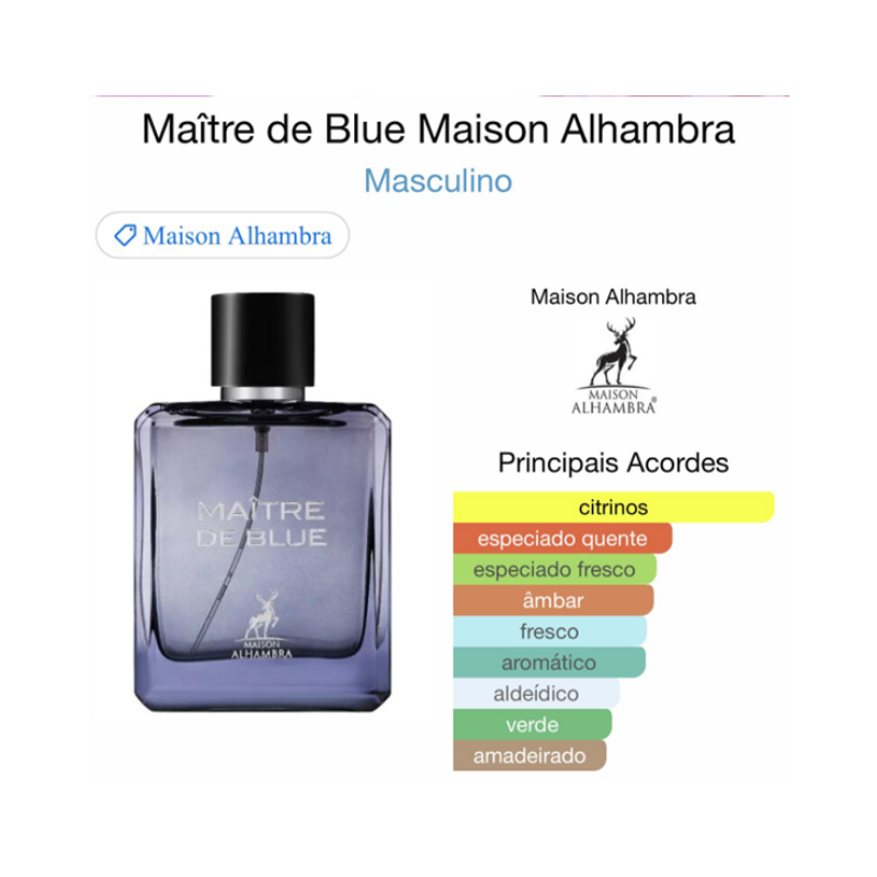 Maître de Blue de Maison Alhambra é um perfume Oriental Amadeirado Masculino. Maître de Blue foi lançada em 2022. As notas de topo são: Toranja, Aldeídos, Limão, Hortelã, Bergamota e Pimenta Rosa. As notas de coração são: Gengibre, Jasmim, Melão e Noz-moscada. As notas de fundo são: Âmbar, Incenso, Sândalo, Ládano, Patchouli e Agarwood (Oud).