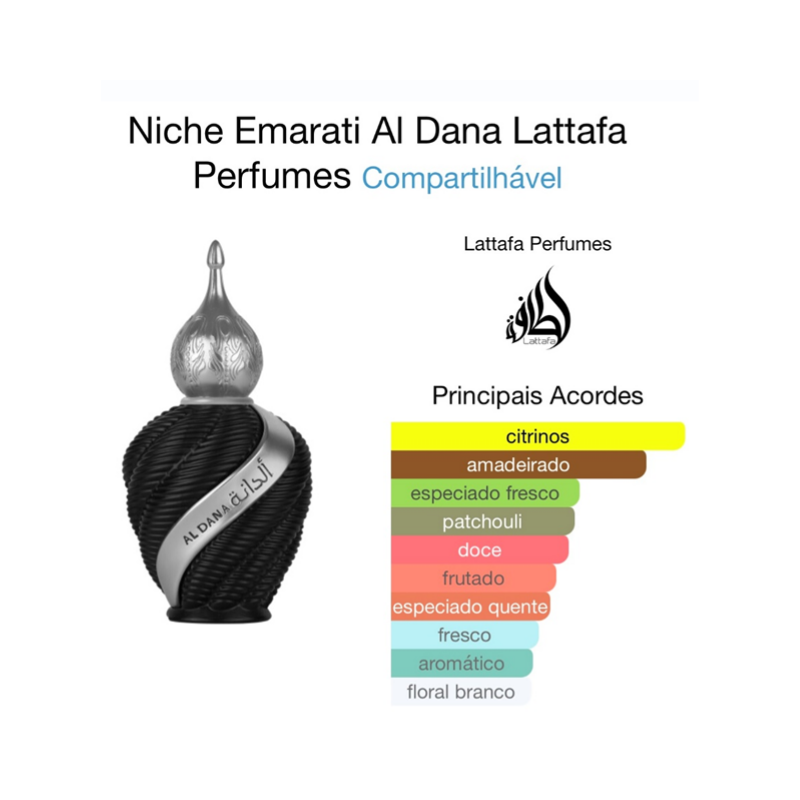 Niche Emarati Al Dana de Lattafa Perfumes é um perfume Aromático Frutado Compartilhável. Esta é uma nova fragrância. Niche Emarati Al Dana foi lançada em 2024. As notas de topo são: Abacaxi, Lima, Bergamota, Limão e Pimenta. As notas de coração são: Lírio-do-Vale, Olíbano e Jasmim. As notas de fundo são: Patchouli, Notas Amadeiradas, Almíscar, Fumaça e Âmbar.