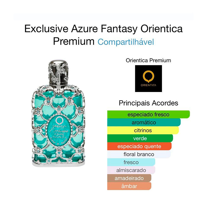 Exclusive Azure Fantasy de Orientica Premium é um perfume Compartilhável. Esta é uma nova fragrância. Exclusive Azure Fantasy foi lançada em 2024. As notas de topo são: Bergamota, Gengibre, Hortelã e Noz-moscada. As notas de coração são: Jasmim, Lírio-do-Vale e Gerânio. As notas de fundo são: Âmbar Cinzento, Madeira Guaiac e Almíscar.