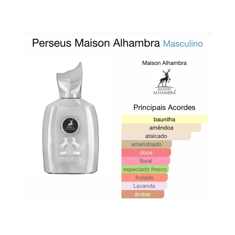 Perseus de Maison Alhambra é um perfume Aromático Masculino. Perseus foi lançada em 2022. As notas de topo são: Heliotrópio, Cominho e Bergamota. As notas de coração são: Amêndoa, Lavanda e Jasmim. As notas de fundo são: Baunilha, Âmbar e Sândalo.
