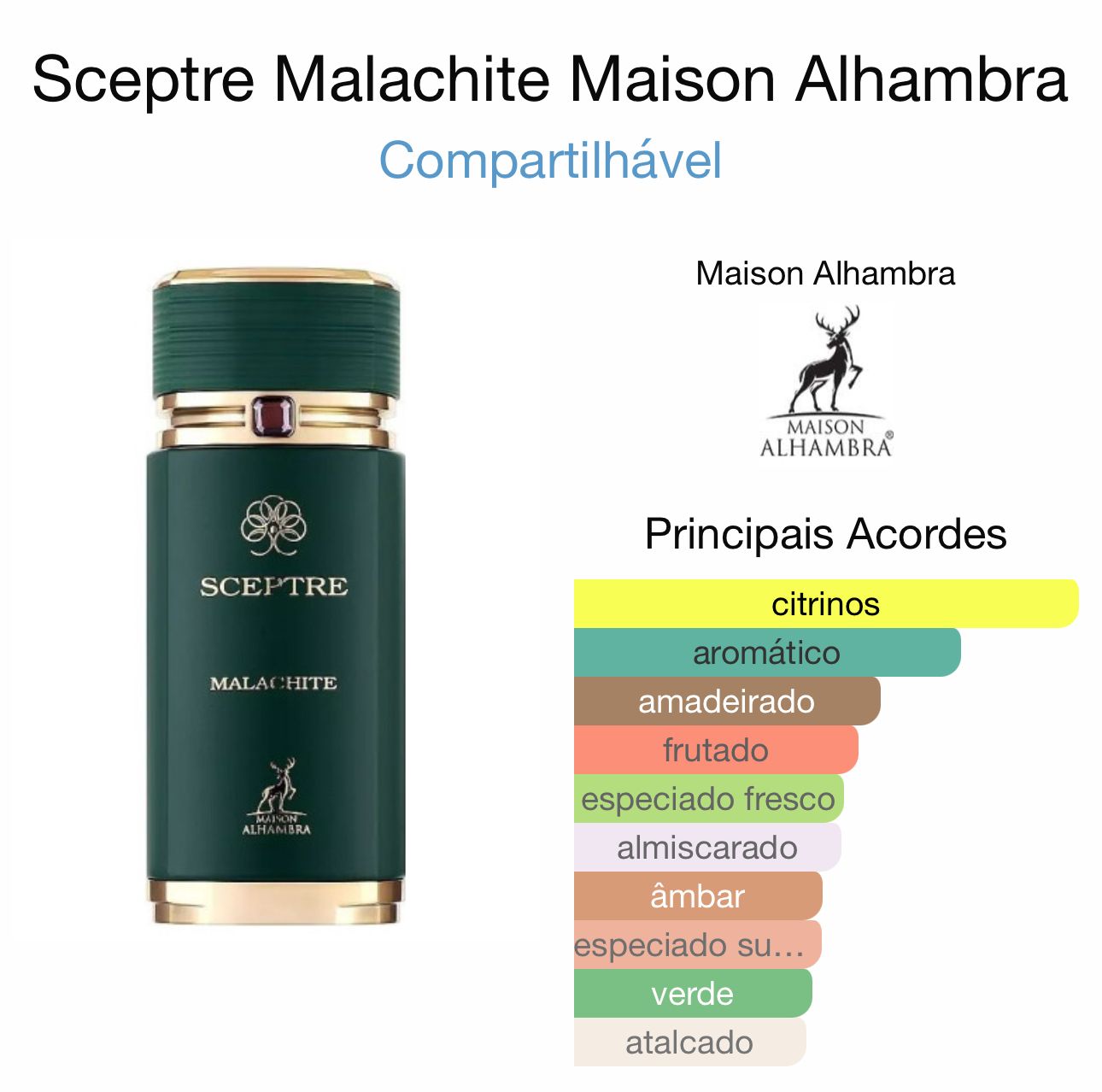 Sceptre Malachite de Maison Alhambra é um perfume Oriental Amadeirado Compartilhável. Sceptre Malachite foi lançada em 2022. As notas de topo são: Tangerina Verde, Bergamota e Groselha Preta. As notas de coração são: Notas Aromáticas, Notas Especiadas, Lavanda, Jasmim e Pimenta Rosa. As notas de fundo são: Almíscar, Âmbar, Notas Amadeiradas e Vetiver.