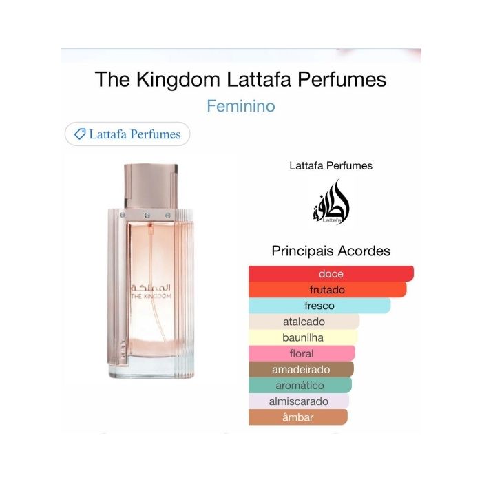 The Kingdom de Lattafa Perfumes é um perfume Floral Frutado Gourmet Feminino. Esta é uma nova fragrância. The Kingdom foi lançada em 2024. As notas de topo são: Pera, Peônia e Cassis. As notas de coração são: Pralinê, Fava Tonka e Jasmim. As notas de fundo são: Almíscar, Sândalo, Baunilha e Âmbar.