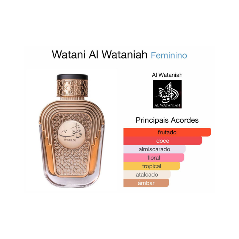 Watani de Al Wataniah é um perfume Aromático Frutado Feminino. Esta é uma nova fragrância. Watani foi lançada em 2022. As notas de topo são: Frutas, Frutas Tropicais e Notas Herbais. As notas de coração são: Frutas, Notas Florais e Notas Doces. As notas de fundo são: Almíscar, Notas Doces e Âmbar.