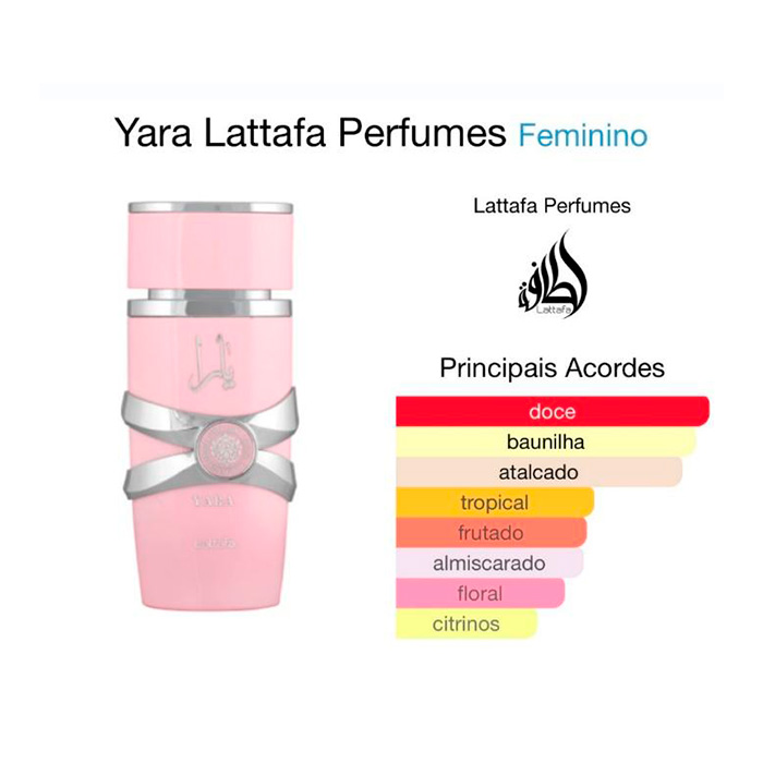 Yara de Lattafa Perfumes é um perfume Âmbar Baunilha Feminino. Yara foi lançada em 2020. As notas de topo são: Orquídea, Heliotrópio e Tangerina. As notas de coração são: Acorde Gourmand e Frutas Tropicais. As notas de fundo são: Baunilha, Almíscar e Sândalo.